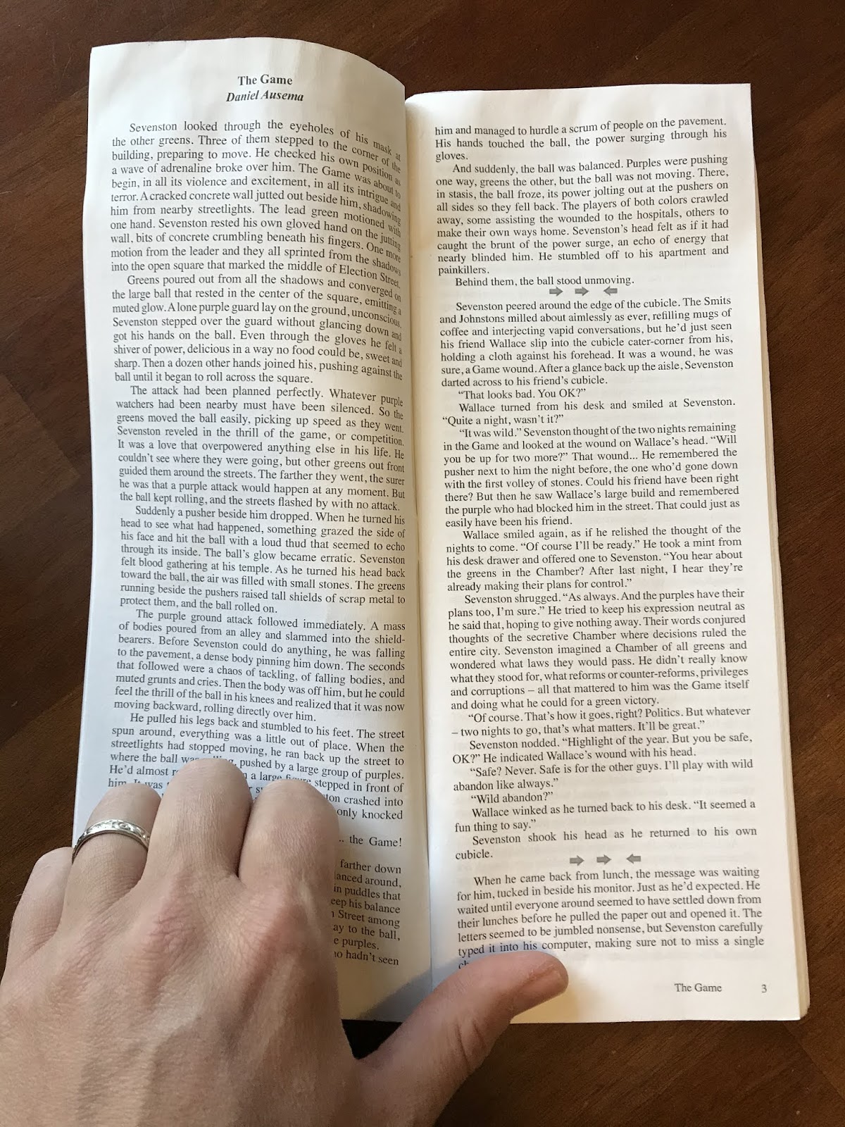 I mentioned in my November Lyrical Worlds newsletter that I would share pictures of the original publication of the reprinted story in it, "The Game."Fictitious Force had a unique shape. I suppose it was simply folded the other direction (hotdog bun style instead of hamburger bun style, as I used to explain to kids), but it definitely makes it stand out in my box of contributor copies. The cover for this issue was even inspired by my story, so that's a cool thing.