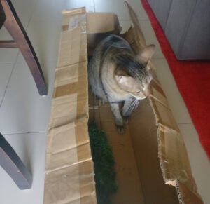 They kept shooing me away so I sat in one of the big boxes. It was bigger than all the food I’m ever going to eat. I don’t know how they got it through the door, but this cardboard palace was so spacious I could run circles inside it without ever bumping into a wall. It smelled kind of woodish.